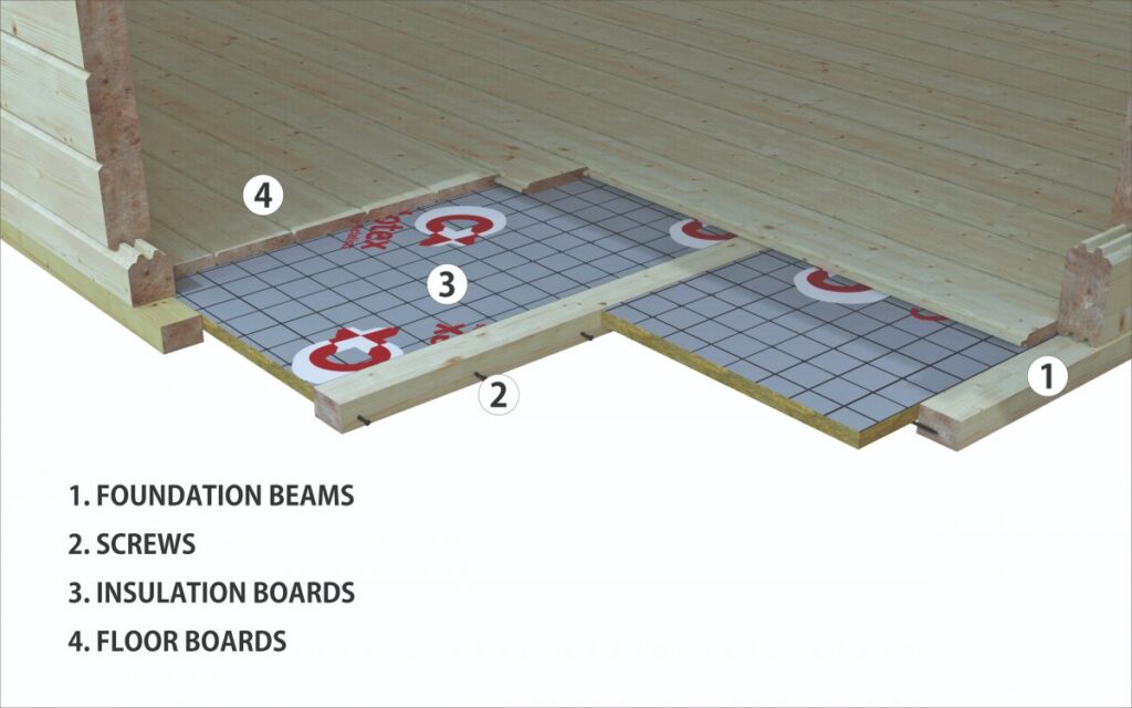 Gulvisoleringspakken består af 25 mm isoleringsplader. Vi anbefaler at bruge skruer til at understøtte isoleringspladerne og holde alle plader i samme niveau under gulvbrædderne. Fastgør først skruerne i fundamentbjælkerne 25 mm fra bjælkens overkant. Skær derefter isoleringspladerne til, så de sidder tæt mellem gulvbjælkerne, montér isoleringspladerne og derefter gulvbrædderne. Skruerne skal sættes i på begge sider af de indvendige gulvbjælker med cirka 30 cm mellemrum langs deres længde. Isoleringspladerne skal sidde tæt mellem bjælkerne og blive på plads, så skruerne fungerer som en ekstra mekanisk fastgørelse i tilfælde af, at vibrationer ovenfra eller bevægelser i hytten får isoleringspladen til at falde ned.